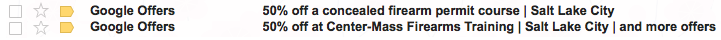 And my favorite… gun offers. Oh Google, you’re so silly. I don’t own firearms, want to own firearms or need to own firearms. So firearm training? Not really my thing.