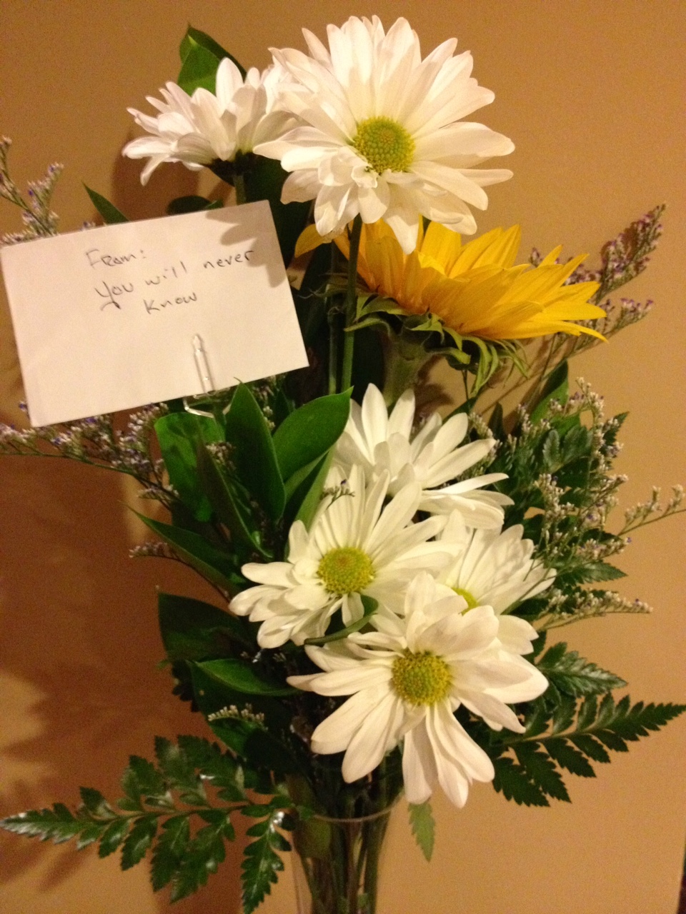 My stomach felt a little queasy and the following thoughts sped through my mind: What the fresh hell? Pretty flowers, though. Shit, how does this person know I love sunflowers and daisies? Ugg, what else do they know about me? Which brother should I ask to sleep on my couch tonight in case someone tries to murder me? Do I choose the brother I want to spend my last moments with, or do I choose the one with the most free time. Dammit! I wonder if I could find a Hello Kitty gun at a local gun shop. Wait, do Hello Kitty guns require regular bullets or cuter, more sparkly ones?